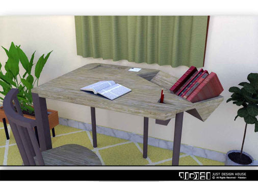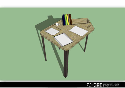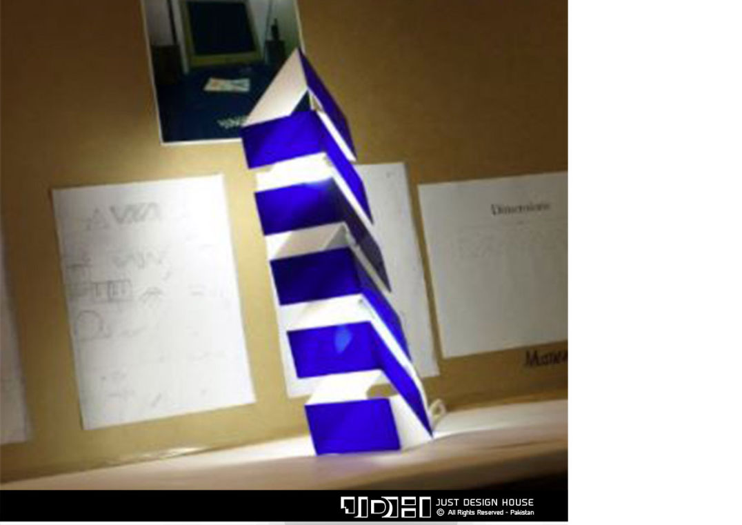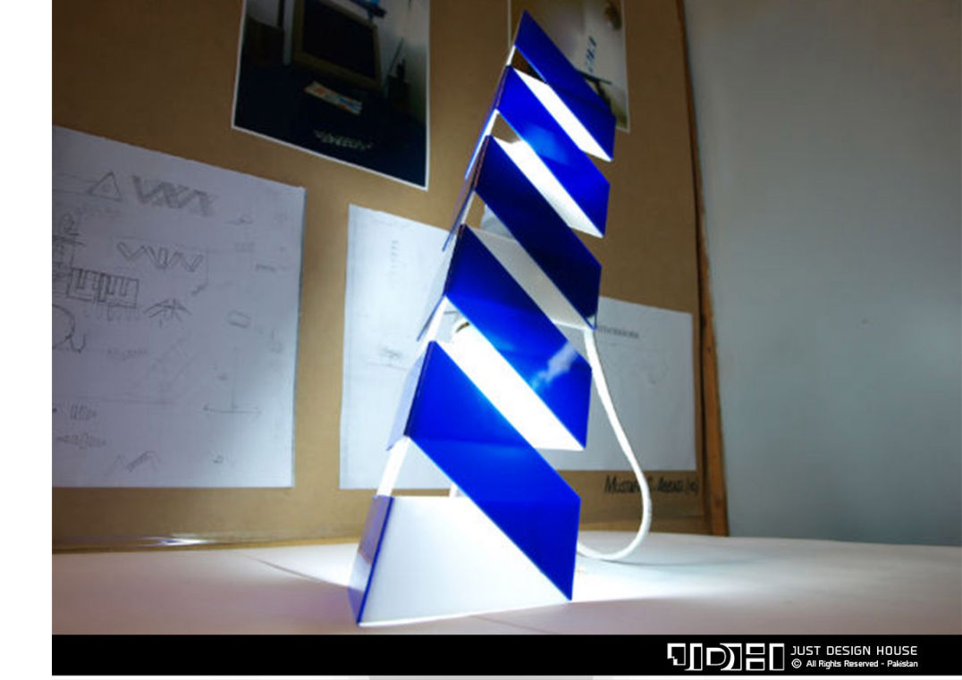 An unusual lamp looks like a folded paper on a table, seems like a part of the study table.